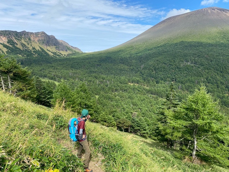 Jバンドを降りたところで、前掛山と黒斑山を両側に、絶景を楽しみながら昼飯を食べました。