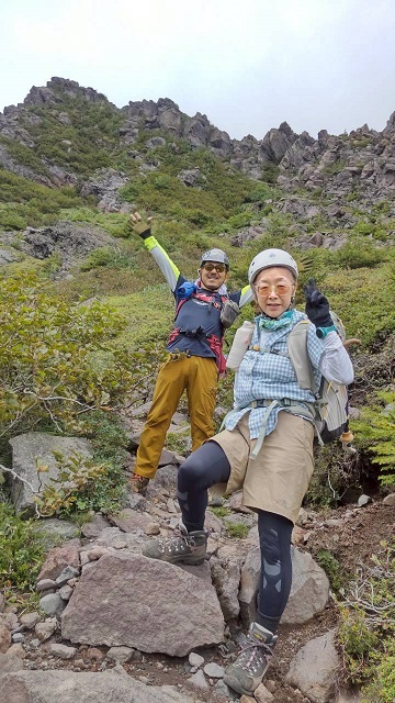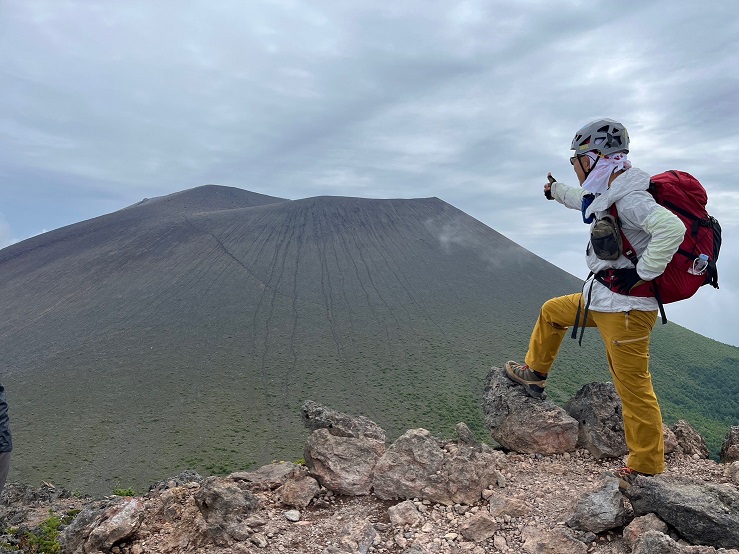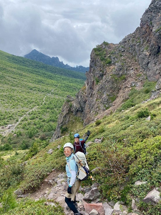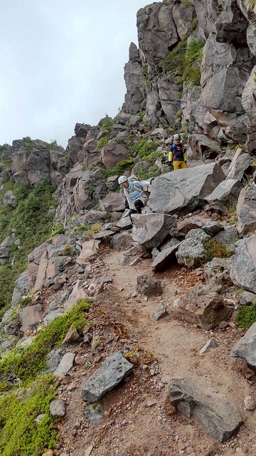 仙人岳から先は岩々が多くなってきたので、浅間山は火山だからと持ってきたヘルメットをかぶりました。