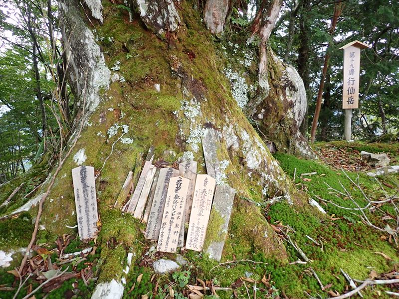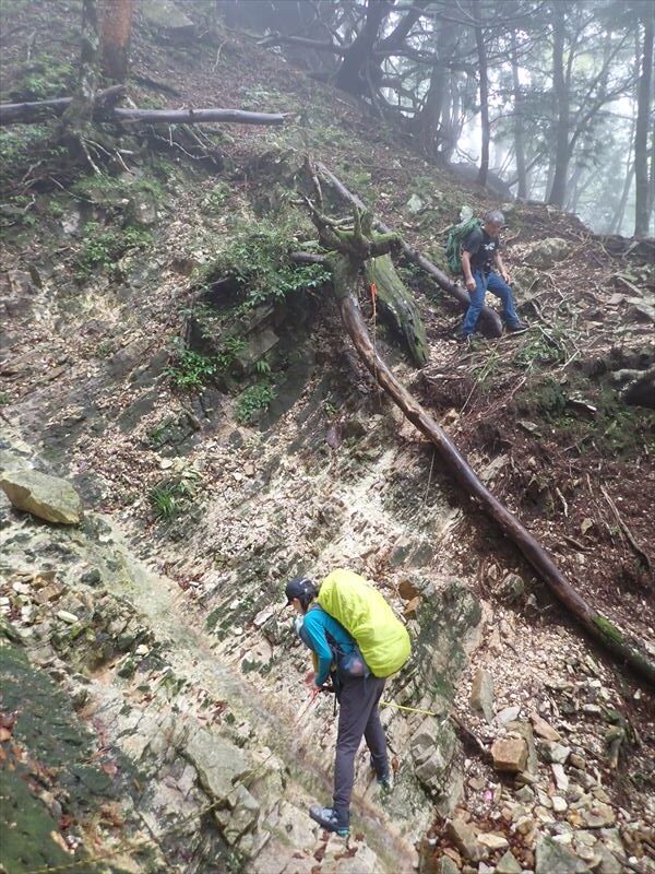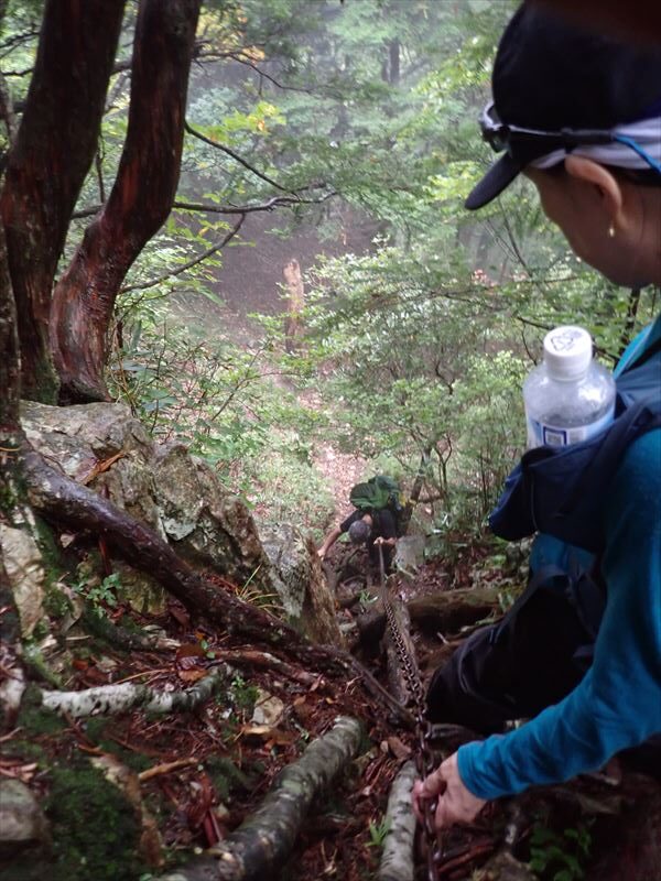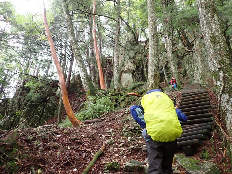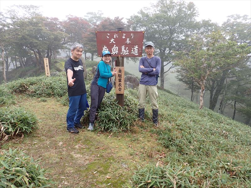 前泊した前鬼(ぜんき)の小仲坊では(かつて役行者に付き従った鬼の子孫という)管理人夫婦とわれわれ、そして5,6人の同宿者とで膳を並べ、酒で身を清めながらあれこれ歓談。こういう所に集まる人は皆面白い。いつまでも残って欲しい宿だ。翌朝は、山伏装束に身を包んだ龍谷大学の修行者(若い女性)が法螺貝を吹いてわれわれの出発を見送ってくれた。小雨で気温は高め。雨具を着たり脱いだりしながら最初の急登をこなす。850段余りの滑りやすい木の階段もあって稜線の太古ノ辻までゆっくり登る。ちなみに、途中まで一緒で天狗山から前鬼に戻った同宿者は下りでこの階段で滑り、手首と腰を負傷したようだ。