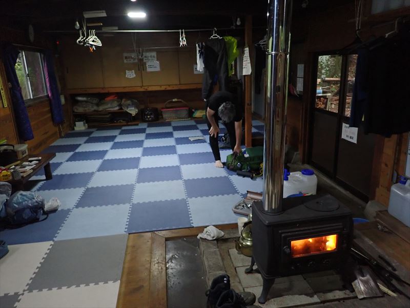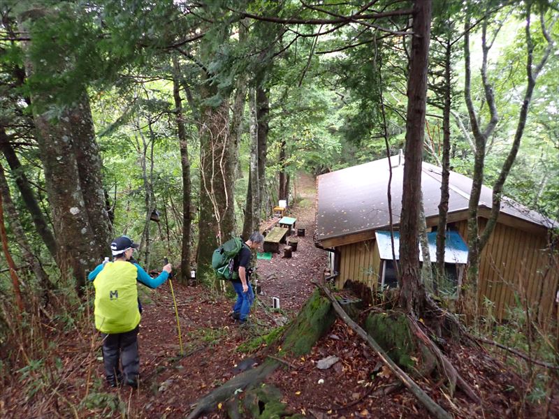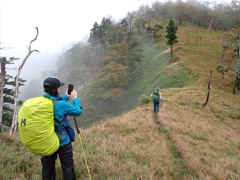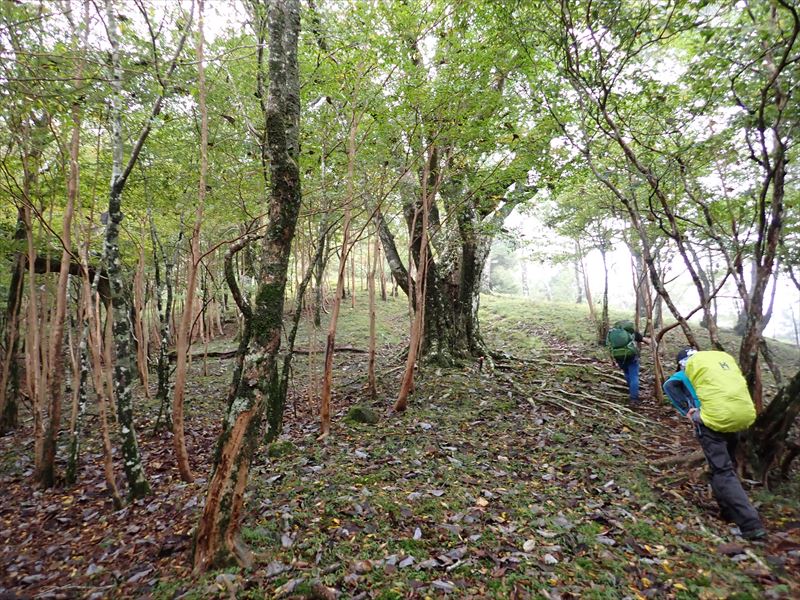 稜線に出ていよいよ奥駈道を南に向かう。広々とした笹原と樹林帯が交互に繰り返される。笹原は5月に来たときよりも伸びて足下が見えづらく注意を要した。ピークを幾つも越えていくのだが、巻き道らしきルートを選ぶと途中で行き詰まったりすることがしばしば。バリエーション的な面白さと楽しむほかはない。計画より少々遅れて着いた持経ノ宿は居心地満点の無人小屋だった。枯れない水場が近く、小屋内には全面にマットが敷かれ毛布が山のように用意されている。バッテリーのもつ間だけだが電気照明も完備。薪ストーブもあって暖を取ったり衣類を乾かしたりしながら、持ち上げたビールやワイン、日本酒で話に花が大いに咲いた。キャパ20人というが宿泊者はわれわれ3人だけ。南奥駈道の山小屋やルートは新宮山彦ぐるーぷという地元組織が管理・整備している。