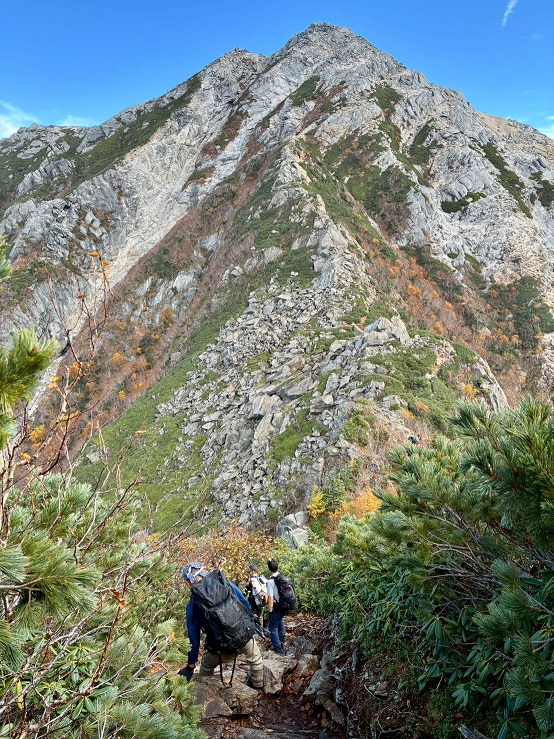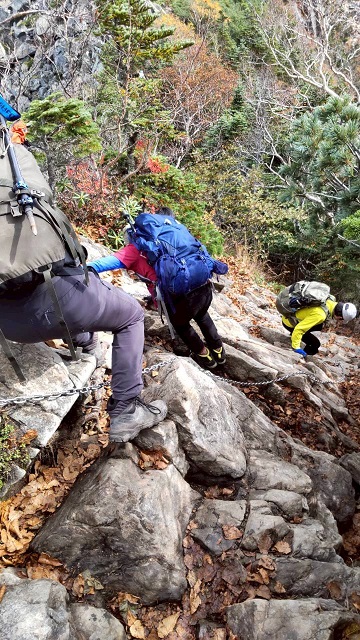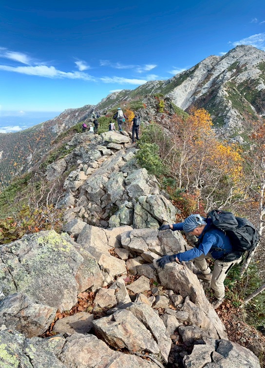 甲斐駒へのルートは標高が上がるに従い、険しくなって、手足で這い上がる箇所も増えてきます。
